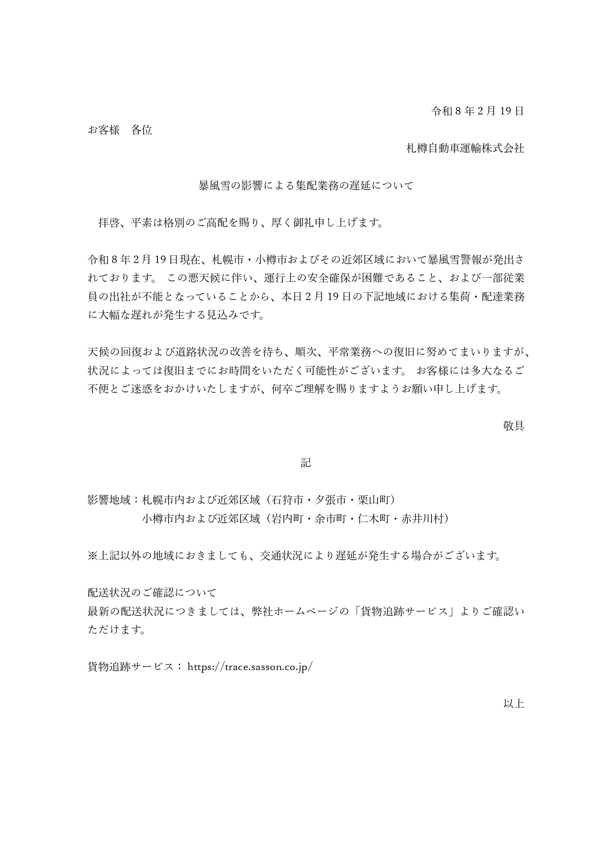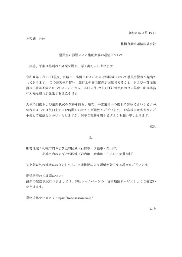 令和8年2月19日現在、札幌市・小樽市およびその近郊区域において暴風雪警報が発出され ております。 この悪天候に伴い、運行上の安全確保が困難であること、および一部従業員 の出社が不能となっていることから、本日2月19日の下記地域における集荷・配達業務に 大幅な遅れが発生する見込みです。